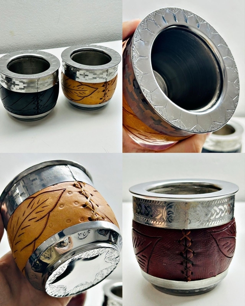MATES DE ACERO FORRADOS EN CUERO GRABADO – DISEÑOS EXCLUSIVOS